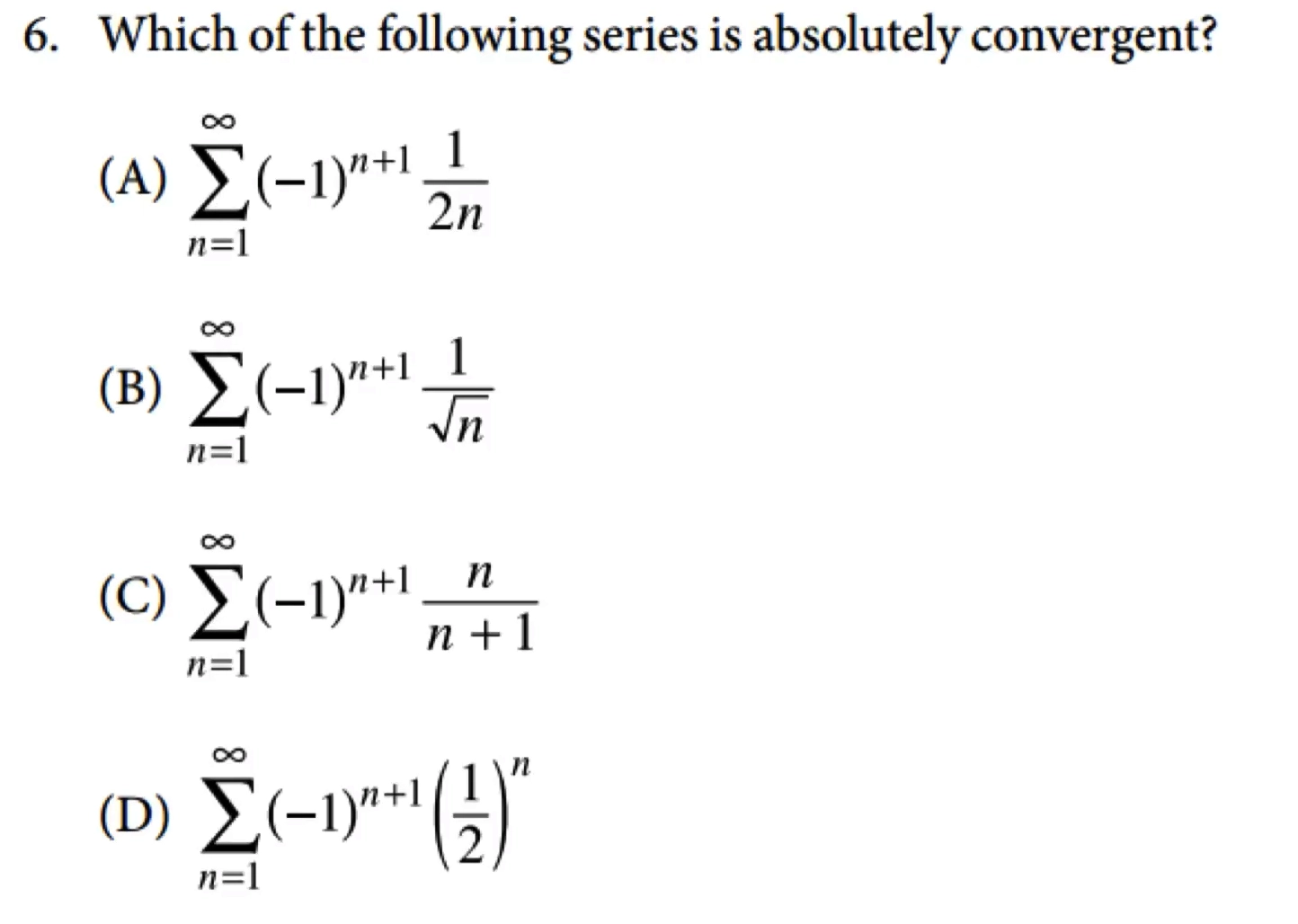 \[S_n = \sum_{n=1}^\infty\frac{(-1)^{n+1}}{n^p} = 1 - \frac 1{2^p} + \frac 1{3^p} - \frac 1{4^p} + \cdots, \;\; p > 0 \;\; \lim_{n \to \infty} \frac 1{n^p} = 0\]