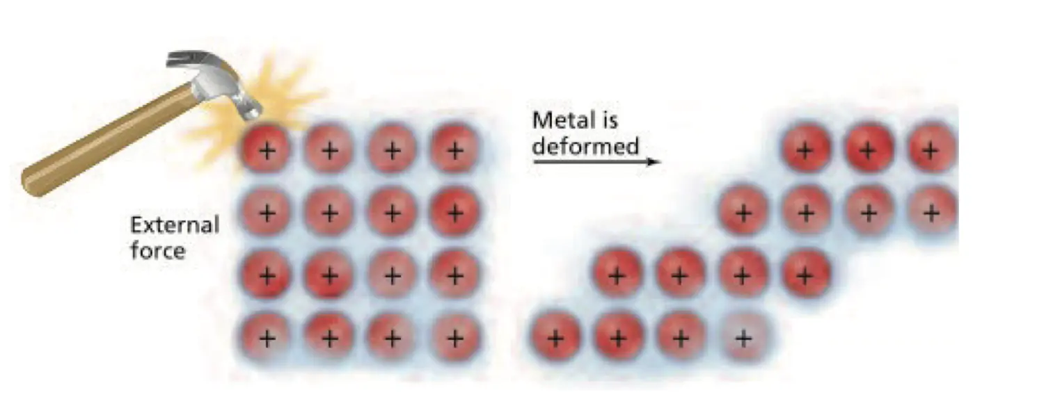 - 金属的延展性很好(Malleable and Ductile),层与层之间可以轻易滑动