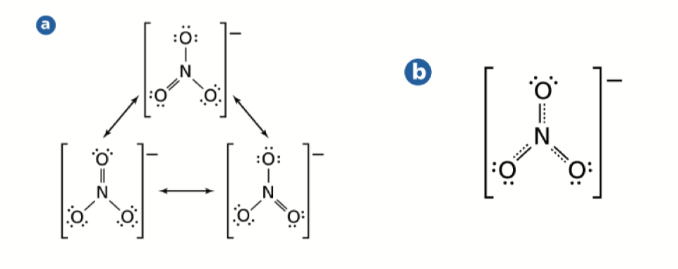 - 所以对于上图,\(\ce{[NO3]-}\) 中 \(\ce{N\bond{~-}O}\) 键长,应介于 \(\ce{N\bond{-}O}\) 与 \(\ce{N\bond{2}O}\) 之间