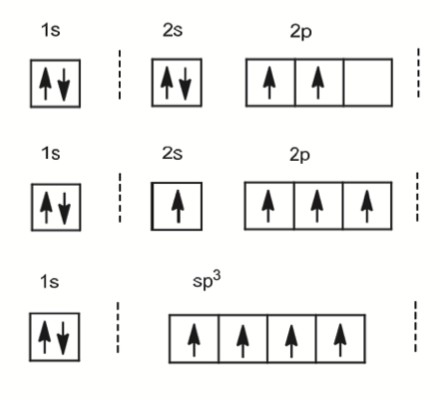 最上方为 \(\ce{C}\) 的初始轨道排布,在杂化过程中首先会将 \(\ce{2s^2}\) 中的电子转移一个到 \(\ce{2p}\) 轨道上形成 \(\ce{2s 2p^3}\),最后合并 $ $两个轨道形成 \(\ce{sp^3}\) 杂化轨道,轨道总数保持相同,这便是 \(\ce{CH4}\) 的 \(\ce{sp^3}\) 杂化。