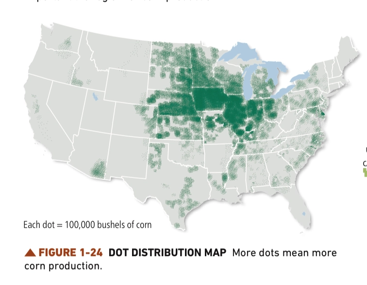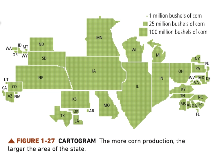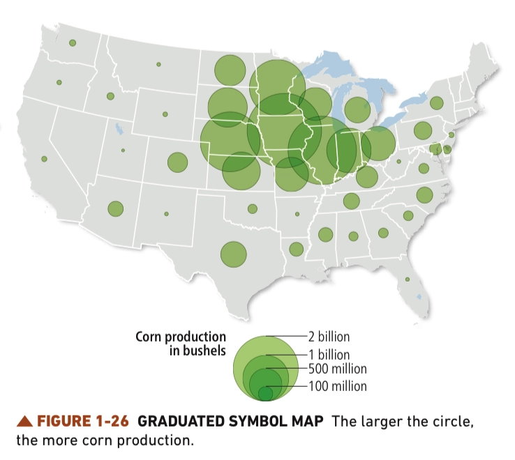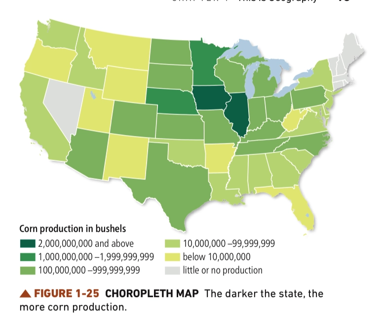 - 可识别的区域按照变量的测量比例进行阴影或图案化。例如,颜色较深的区域可能代表数据的最高范围。