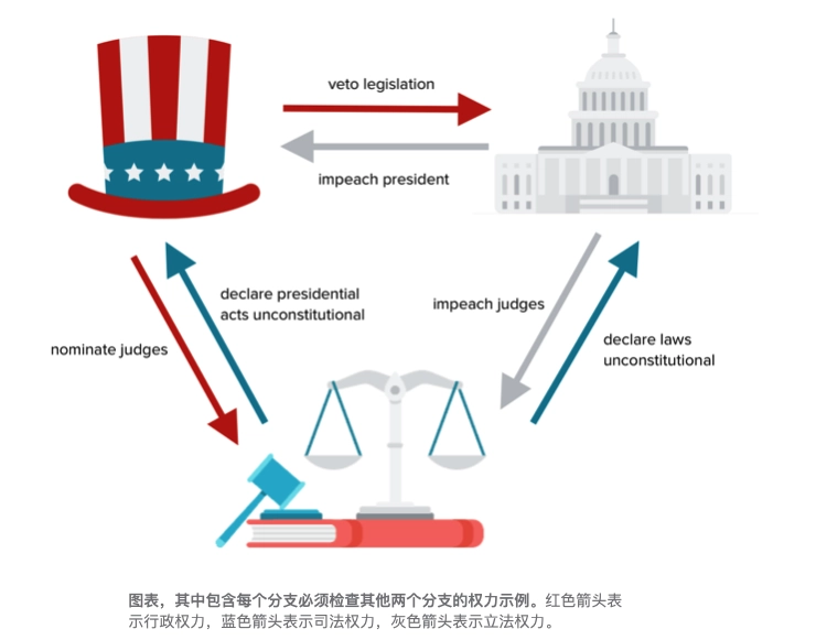 - 麦迪逊认为——因为不可能让所有永远不会试图攫取比他们应该拥有更多权力的政治家成为天使——遏制政府的最实用方法是构建政府,以便政治家必须相互竞争。麦迪逊写道:“Ambition must be made to counteract ambition”