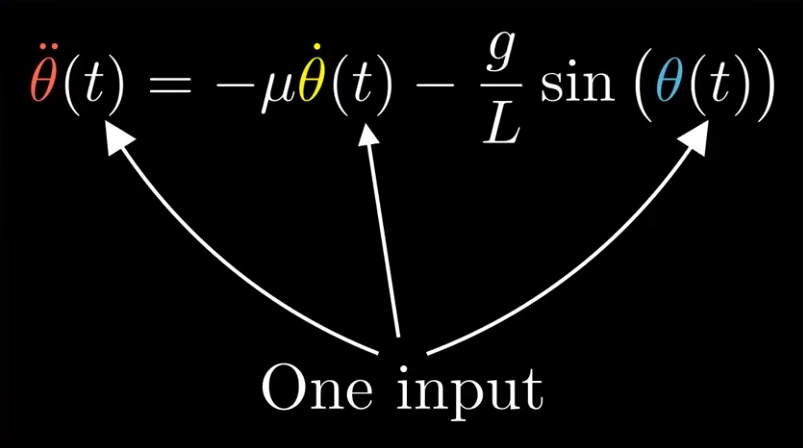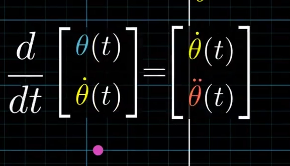 对于 \(\begin{bmatrix} \dot{\theta}(t) \\ \ddot{\theta}(t) \end{bmatrix}\)这个新向量来说,\(\dot{\theta}(t)\) 可以理解为,角度的变化速度,越高则越倾向右边,越低则越倾向左。 \(\ddot{\theta}(t)\) 可以直接替换为我们之前的式子 \(\ddot{\theta}(t) = -\mu\dot{\theta}-\frac{g}{L}sin(\theta)\)。