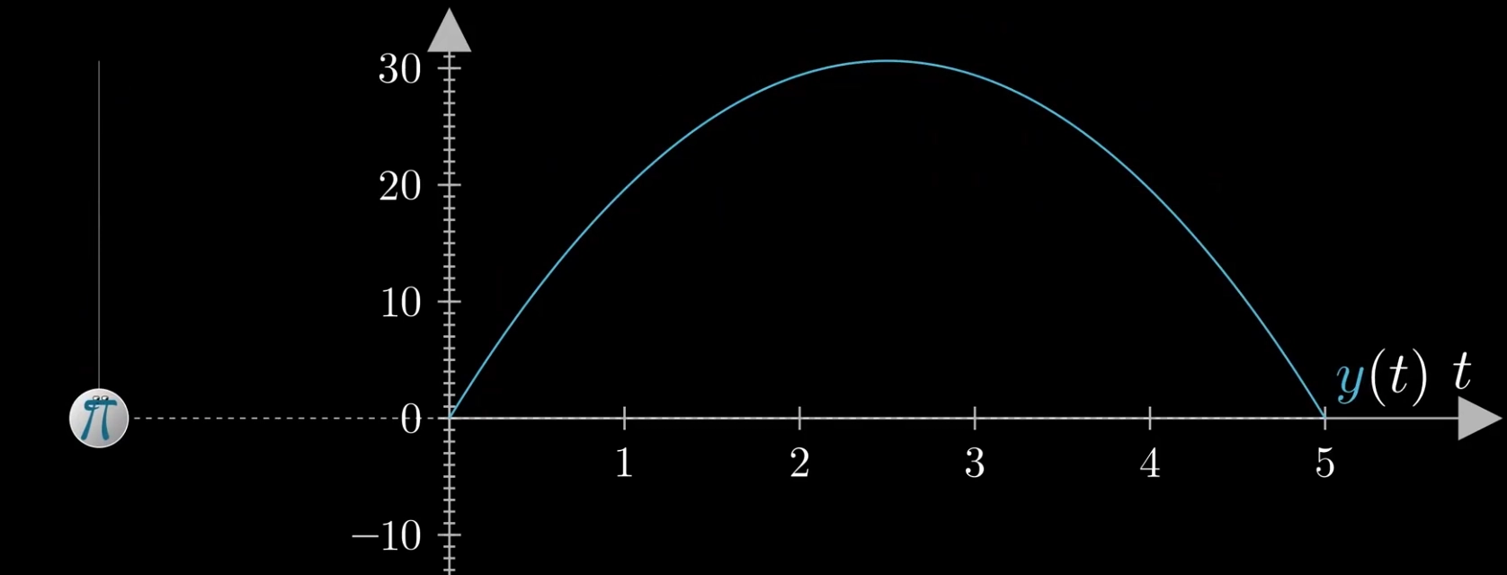 \[\ddot{y}(t) = -g \\ \frac{d^2(?)}{d^2t}(t) = -g \\ \frac{d(?)}{dt} = -gt + v_0 \\ \frac{d(-\frac12gt^2 + v_0t + c1)}{dt} = -gt + v_0 \\ y(t) = -\frac12gt^2 + v_0t + c1\]