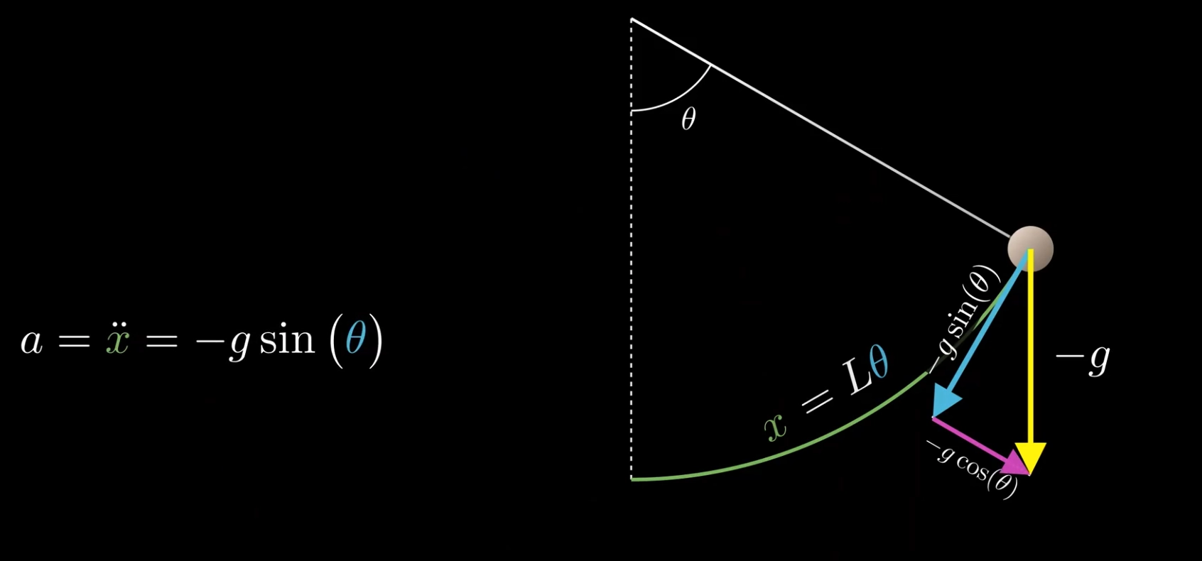 \[\ddot{x} = L\ddot{\theta}=-g\sin(\theta) \\ \ddot{\theta} = -\frac{g}{L}\sin(\theta)\]
