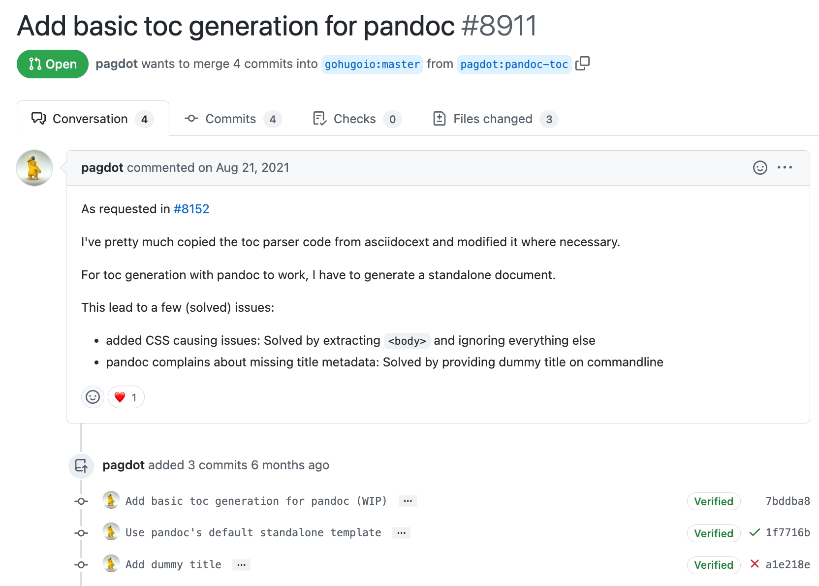 Pandoc渲染器需要在调用参数添加--toc选项为文章自动输出目录,所以我们必须魔改 Hugo 的部分代码。更重要的是,Hugo 主题使用的 TOC 显示一般是通过 Hugo 内部传参,单纯的给
