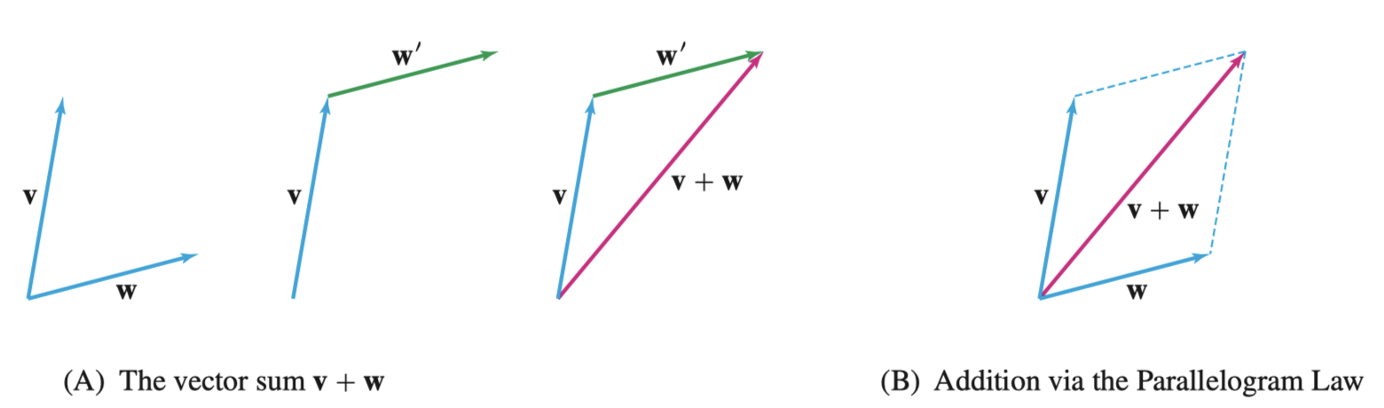 \[ \begin{aligned} &\mathbf{v} + \mathbf{w} = \mathbf{w} + \mathbf{v} & &\text{Commutative Law} \\ &\mathbf{u} + (\mathbf{v} + \mathbf{w}) = (\mathbf{u} + \mathbf{v}) + \mathbf{w} & &\text{Associative Law}\\ &c(\mathbf{v} + \mathbf{w}) = c \mathbf{v} + c \mathbf{w} & &\text{Distributive Law for Scalars} \\ \end{aligned} \]
