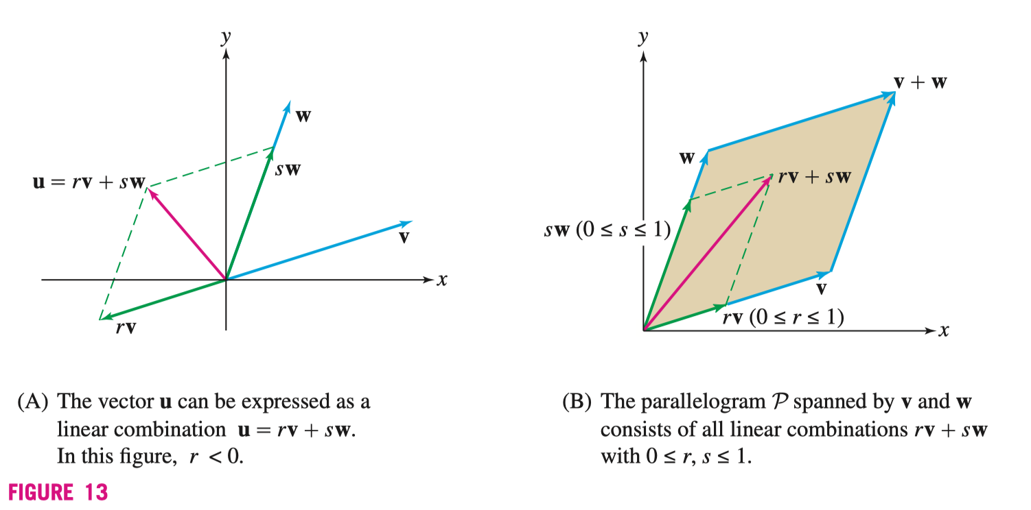 在 \(\mathbf{v}, \mathbf{w}\) 的平面上,任何向量都可以被表示为 \(\mathbf{u} = r \mathbf{v} + s \mathbf{w}\),若 \(0 \leqslant r, s \leqslant 1\) 则包含 \(\mathbf{v}, \mathbf{w}\) 所形成平行四边形内的所有点
