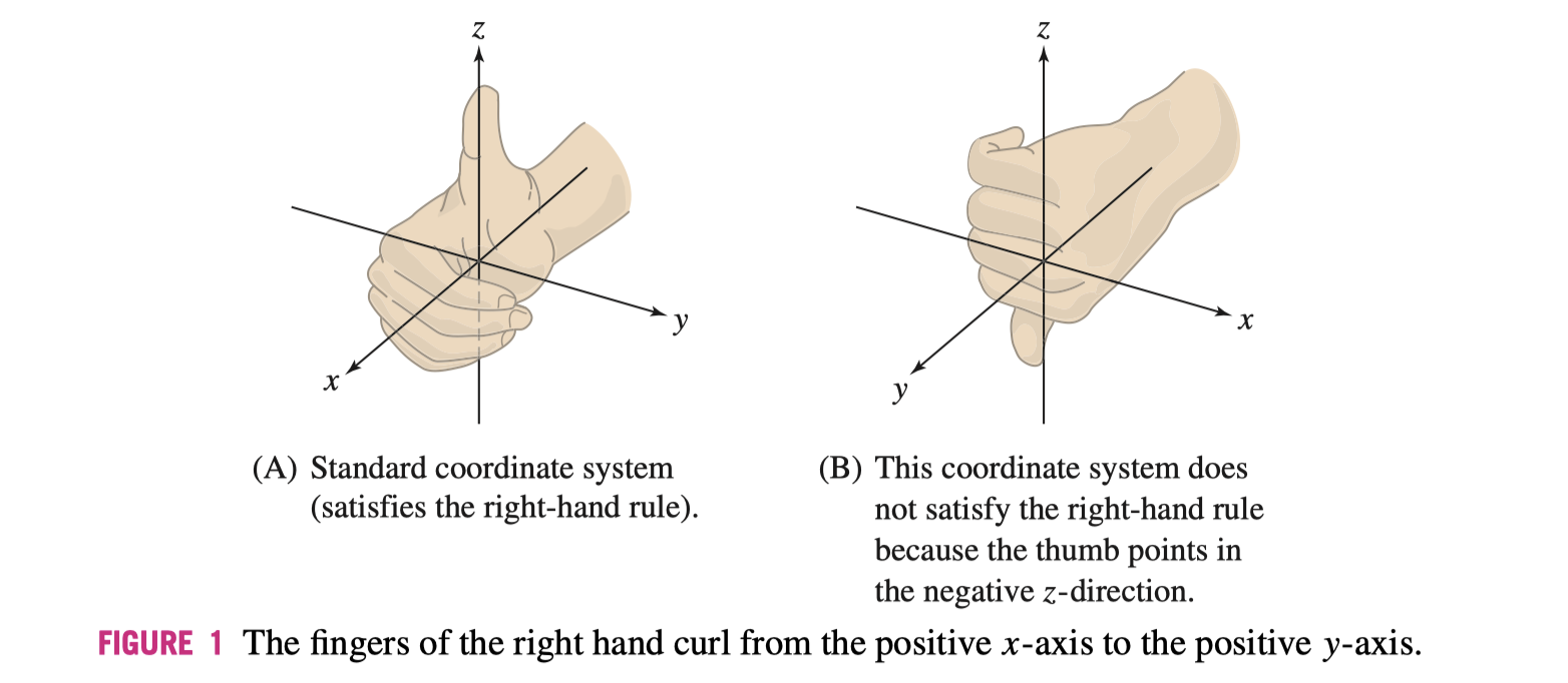 三维坐标系的位置遵循右手定则,即大拇指指向方向为 \(z\) 轴,其他四指指向 \(x\) 轴后握紧。