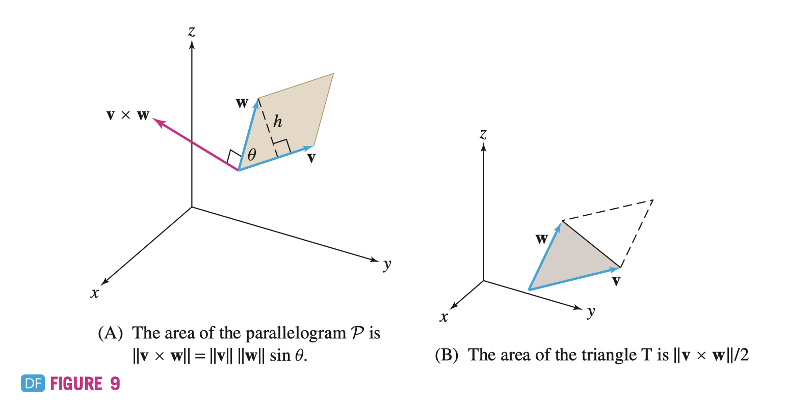 \(\| \mathbf{v} \times \mathbf{w} \|\) 为对于平行四边形的面积,\(\frac{1}{2} \| \mathbf{v} \times \mathbf{w} \|\) 为对应三角形的面积