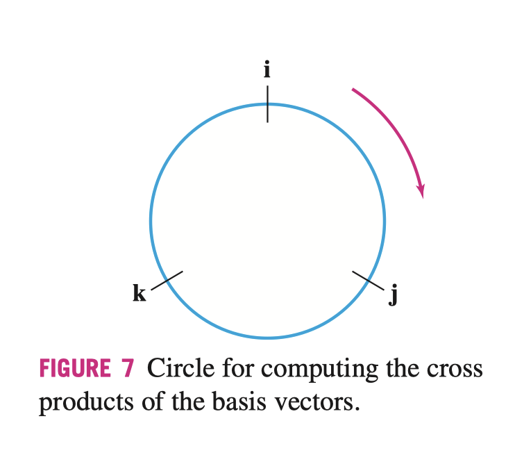\[ \mathbf{i} \times \mathbf{j} = \mathbf{k} \quad \mathbf{j} \times \mathbf{k} = \mathbf{i} \quad \mathbf{k} \times \mathbf{i} = \mathbf{j} \]